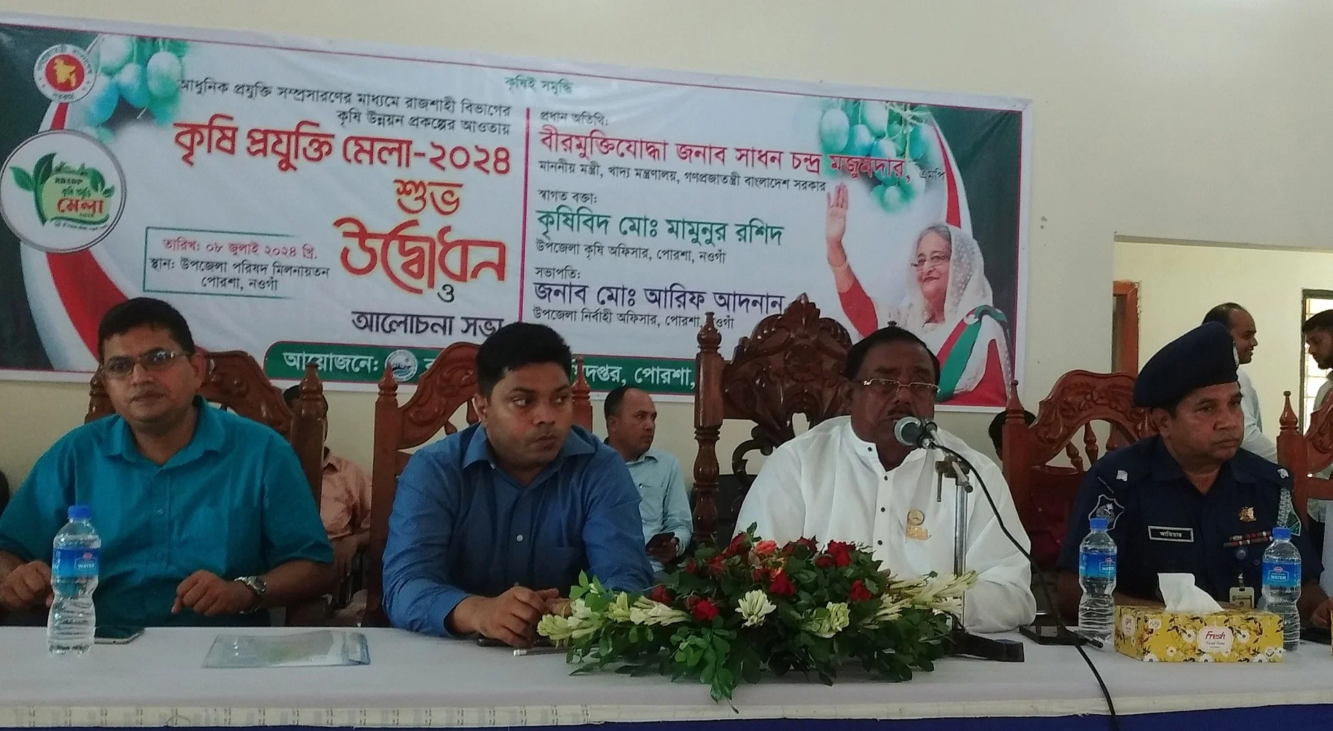 নওগাঁর পোরশায় কৃষি প্রযুক্তি মেলার উদ্বোধনী অনুষ্ঠানে প্রধান অতিথির বক্তব্য রাখছেন খাদ্যমন্ত্রী সাধন চন্দ্র মজুমদার। আজ