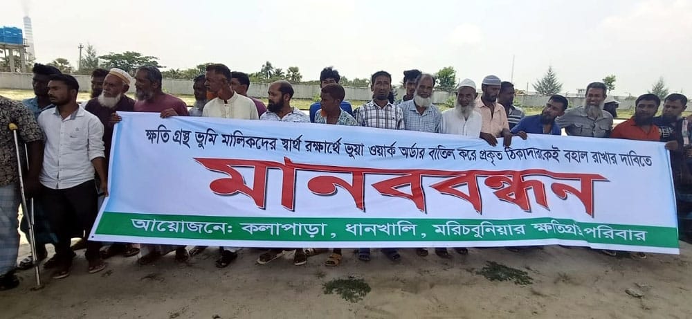 পটুয়াখালীর কলাপাড়ায় ক্ষতিগ্রস্ত ভুমি মালিকদের স্বার্থ রক্ষার্থে ভুয়া ওয়ার্ক অর্ডার বাতিল করে প্রকৃত ঠিকাদারকে বহাল রাখার দাবিতে মানববন্ধন ও বিক্ষোভ